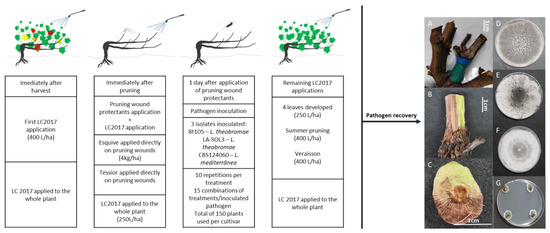 Diagram showing the several steps of the field assay. Information on the products used can be found in Table 4, and a description of the different treatments can be found in Table 5. (A) Marked sample collected from the field prior to analysis; (B) Sample with the bark removed showing sign of necrosis; (C) Sample collected about 1 cm below the pruning wound, to be divided into four pieces and plated onto PDA; (D) Isolate Bt105 (Lasiodiplodia theobromae) recovered from infected pruning wounds; (E) Isolate LA-SOL3 (Lasiodiplodia theobromae) recovered from infected pruning wounds; (F) Isolate CBS124060 (Lasiodiplodia mediterranea) recovered from infected pruning wounds; (G) Petri dish containing wood obtained from non-inoculated control plants showing no signs of pathogen growth.