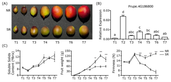 In parallel, the expression profile of the SR candidate gene Prupe.4G186800 (NAC072) was assessed in the same evaluation periods to identify the developmental stages to perform the transcriptomic analysis. The results for the NR fruit showed negligible expression of NAC072 in T1 followed by a peak of expression in T2 (51 DASF), that decreased immediately in T3, maintaining a low expression level until T7 (Figure 1B). The results for the SR fruit showed no expression of NAC072 at any developmental stage.