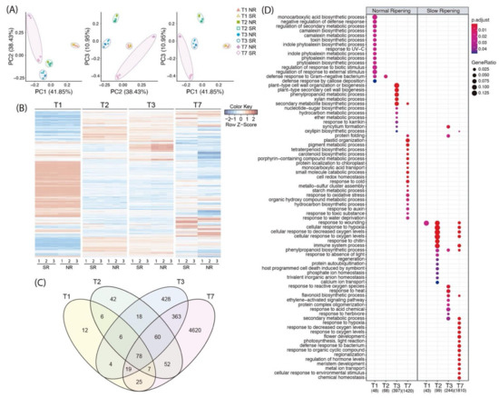 Differential expression analysis between NR and SR phenotypes. Graphical representation of differentially expressed transcripts for the four developmental stages analyzed (T1, T2, T3, T7) between the NR and SR phenotypes. (A) Principal component analysis using differentially expressed transcripts. The different stages are separated in colored circles of red, green, blue and purple for T1, T2, T3 and T7, respectively. The NR phenotype is represented with fullly colored figures and the SR phenotype is represented with line colored figures. (B) Heatmap of differentially expressed genes between NR and SR phenotypes. The red and blue lines represent genes with up and down regulated expressions, respectively. The four developmental stages are separated, and each column represents one independent biological replicate expression result. (C) Venn diagram representing the differentially expressed transcripts. In yellow, green, blue and purple, the differentially expressed transcripts only occurring in T1, T2, T3 and T7, respectively are represented, and the number of identified genes differentially expressed in all developmental stages are presented in grey. (D) Gene ontology term enrichment analysis of normal and slow ripening phenotypes in fruit development. The blue-red scale color represents the adjusted p-value and the point size represents the DE gene ratio.