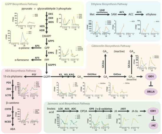 Even though we did not observe the exact behavior of GGPP and ABA biosynthesis in GA production (Figure 3, orange section), a significant difference was observed in the expression profile of one GA3ox in T2 with a lower expression level in the SR siblings. The candidate genes NAC072 (Figure 1B) and AFS (Figure 3 yellow section) had same point of highest expression. This enzyme produces bioactive GA and is a critical enzyme in GA activity and regulation, suggesting lower bioactive GA production in SR siblings.
