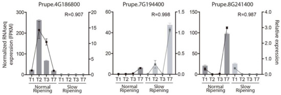 Validation of RNAseq results by qPCR. Comparison between normal and slow ripening expression profiles determined by RNAseq and qPCR of three differentially expressed candidate genes are displayed. The left axis represents the expression profile, in FPKM, of genes measured by RNAseq (bars). The right axis presents the relative expression profiles of genes measured by qPCR (lines). A Pearson correlation was calculated between the RNAseq and qPCR expression data and presented in each graph as the R value.