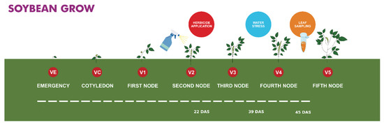 Schematic representation showing the timeline of soybean growth stages. Herbicide application, drought stress, and sample collection have been also included in color balloons indicating the time of the event within the soybean cultivation period.