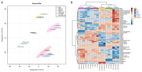 Exploratory analysis of proteomic profiles. (A) Scores plot for Partial least square-discriminant analysis (PLS-DA). Ovals show 95% confidence interval for each treatment. This is a scatter plot for the 2 components having the greatest variations. Observations that are similar will fall close to each other displaying a clustering-like pattern. Component 1 (X-axis) contains 9.8% of the total variation and component 2 contains 6.5%. (B) Hierarchical Clustering heatmap. Hierarchical clustering was performed considering the top 50 FDR corrected t-test p value (<0.05) passing proteins. Horizontal axis shows the biological samples analyzed in the study and vertical axis denotes Uniprot accessions for the proteins. On top of the heatmap samples are identified by treatment. Dendrogram for samples is shown on top of the heatmap and proteins’ dendrogram on left side of the heatmap. Dark blue to dark red color gradient denotes lower to higher expression.