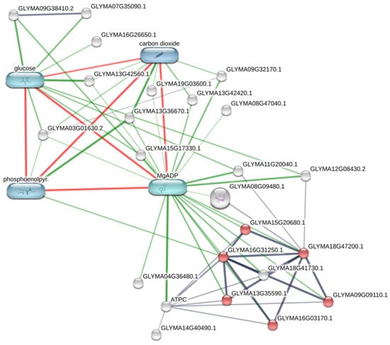 Stitch chemical prediction showed MgADP, glucose, phosphoenolpyruvate (PEP), and carbon dioxide as interaction partners to the DE proteins. The involved biochemical pathways are related to carbon fixation, carbohydrate metabolism (beta galactosidase enzyme (GLYMA13G42560.1; log2FC = −3.0) and the phosphoenolpyruvate carboxylase enzyme (GLYMA13G36670.1; log2FC = −3.1)). It also includes the metabolism of N-glycan processing and the metabolism of protein folding in the endoplasmic reticulum (glucosidase) (GLYMA07G35090.1; –log2FC = −2.9); the calreticulin pathway (GLYMA09G38410.2; log2FC = −3.0]); redox metabolism (aldehyde dehydrogenase domain-containing protein) (GLYMA09G32170.1; log2FC = −2.9) and protein-methionine-S-oxide reductase metabolism (GLYMA04G36480.1; log2FC = −2.5))). All these proteins were shown to be downregulated in the GM variety.