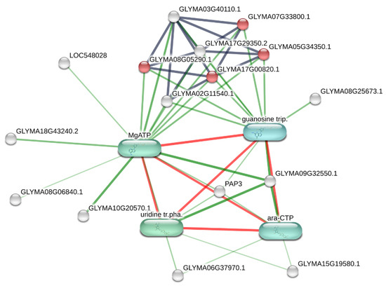 First, GM plants treated with glyphosate-based herbicide were compared to the control GM samples (GM_H vs. GM). A total of 21 proteins were significantly affected in response to herbicide application, with nine being upregulated and 12 downregulated, and 18 protein ID hits identified by Stitch program. Similar to previous results, KEGG pathway enrichment analysis also revealed the ribosome pathway as the most significantly enriched pathway (FDR adj. p value = 0.014). These proteins can be observed as red dots in the metabolic network shown in Figure 4. PFAM and INTERPRO analysis assigned these proteins to ribosomal protein S9 and S5 domains. The Stitch network also predicted significant interactions with MgATP, guanosine triphosphate, uridine triphosphate, and cytidine (araCTP) chemicals. MgATP strongly interacted with magnesium chelatase (I1LAA1–GLYMA18G43240.2, log2FC = −2.9), a downregulated protein involved in chlorophyll biosynthesis, as well as the acetyl-CoA and fatty acid biosynthesis proteins beta-ketoacyl synthase I (Q9M507-GLYMA05G25970.1 LOC548028, log2FC = −3.2) and uncharacterized acetyl-CoA dehydrogenase protein (K7MTK7-GLYMA18G43240.2, log2FC = −2.7). Protein involved in transcription was uncharacterized DNA-binding protein (C6SXZ4–GLYMA09G32550.1, log2FC = −3.1) and in dephosphorylation was purple acid phosphatase PAP3 (Q6YGT9-GLYMA17G11790.1 PAP3, log2FC = −3.0), which was also shown to play a central role in the altered metabolic network (Figure 5; Table S2). In addition, herbicide treatment resulted in significant overexpression of proteins linked to the ABA signaling pathway and abiotic stress response: C2 domain-containing protein (A0A0R0I760–not in the map, log2FC = 3.3) and uncharacterized remorin-like protein (C6SVM4–not in the map, log2FC = 2.7); cell redox homeostasis: thioredoxin domain-containing protein (I1KDX9–GLYMA06G37970.1, log2FC = 2.9); ATP and peptide hydrolysis: Obg-like ATPase (K7L8F3-GLYMA08G25673.1, log2FC = 3.1) and uncharacterized peptidase protein (I1MHG0–GLYMA15G19580.1, log2FC = 3.1).