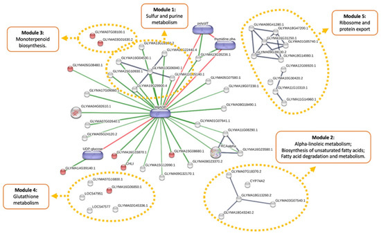To facilitate the interpretation of the data, we highlighted five major functional modules that correspond to the most significantly enriched pathways (257 protein ID hits in Stitch versus 257 protein IDs entry) (Figure 6; Table S3). As expected, biosynthesis of secondary metabolites (FDR adj. p value = 0.003) was among the altered pathways, with DE proteins also involved in other metabolic modules (red dots in the map). The first module includes the sulfur (FDR adj. p value = 3.5 × 10−5) and purine (FDR adj. p value = 0.0002) metabolic pathways. These altered pathways showed a strong interaction with MgADP, a significant predicted chemical playing a central role in the interaction network of DE proteins. Module 2 is composed of altered pathways of alpha-linoleic metabolism (FDR adj. p value = 0.003), biosynthesis of unsaturated fatty acids (FDR adj. p value = 0.004), as well as metabolism (FDR adj. p value = 0.04) and degradation (FDR adj. p value = 0.019) of fatty acids. Most of the DE proteins associated with these pathways were downregulated in response to drought stress (K7L1W0-GLYMA07G18370.2; A0A0R0F201-GLYMA18G43240.2; A0A0R0KRB3-GLYMA03G07540.1; log2FC = −2.7), but one associated with steroid metabolism was altered under combined herbicide and drought stresses (I1LJJ4-CYP74A2, log2FC = −2.7). Monoterpenoid biosynthesis pathway (FDR adj. p value = 0.012), module 3 in the network, was upregulated in the drought-stressed plants. On the other hand, module 4 represented the glutathione metabolic pathway (FDR adj. p value = 0.001), which included the DE proteins glucose-6-phosphate 1-dehydrogenase (A0A0R0FM59-GLYMA16G06850.1, log2FC = −2.5) and glutathione transferases (K7KBB0-GLYMA02G45336.1, log2FC = −2.7; Q9FQD4-LOC547951, log2FC = −2.7; I1KK55-GLYMA07G16800.1, log2FC = −2.2; K7L1L7-LOC547577, log2FC = −2.2), which were significantly downregulated in GM plants under accumulated herbicide and drought stresses. Additionally, module 5 represents the altered pathways involved in genetic information processes, ribosome (FDR adj. p value = 0.018) and protein export (FDR adj. p value = 0.018).