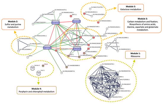 Module 4 represents the porphyrin and chlorophyll metabolic pathways (FDR adj. p value = 0.026), which showed a lower abundance of ferritin proteins (I1MYZ8-GLYMA18G02800.1 ferritin-3, log2FC = −2.4; I1JIE0-GLYMA02G43040.1 Fer2-1, log2FC = −1.6) involved in redox homeostasis of chloroplasts and Fe storage and bioavailability.