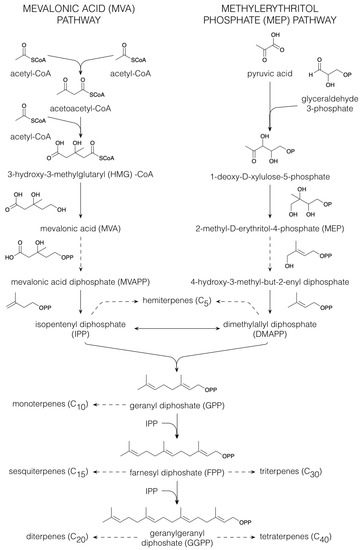 - Dewick, P.M. The mevalonate and methylerythritol phosphate pathways: Terpenoids and steroids. In Medicinal Natural Products; John Wiley & Sons Ltd: Hoboken, NJ, USA, 2009; pp. 187–310. [Google Scholar]