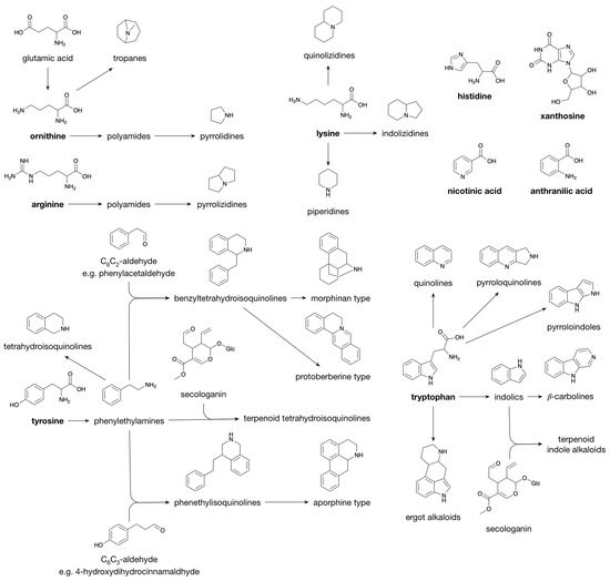 Alkaloids are characterized by great structural diversity and physiological properties. The sole thing that alkaloids have in common is the presence of a nitrogen atom, mostly present in a heterocyclic ring. This nitrogen atom in alkaloids originates mainly from amino acids, and, in general, the carbon skeleton of the particular amino acid is incorporated in the alkaloid structure, hence, classification is based on their biosynthesis precursor [45]. However, some alkaloid classes derive only their nitrogen atom from an amino acid via a transamination reaction, while the remainder of the structure is derived from, e.g., acetate, shikimate, terpenoids or steroids; these are classified as pseudoalkaloids [45]. Most alkaloids are derived from ornithine (derived from glutamic acid in plants), arginine, lysine, tyrosine and tryptophan. Furthermore, minor alkaloid classes are produced from histidine (imidazole alkaloids), nicotinic acid (pyridine alkaloids), anthranilic acid (quinazoline alkaloids) and xanthosine (purine alkaloids) [45].