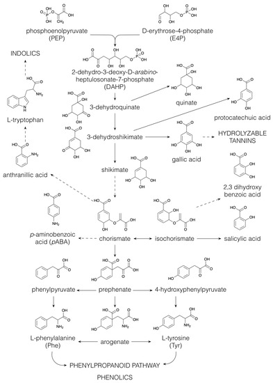 Embryophytes, or land plants, appeared in the mid-Paleozoic era, between 480 and 360 million years ago. The successful adaptation of Charophyceae from living underneath the water to living on land was achieved by the production of phenolic compounds, which act as antioxidants in the protection against UV radiation [54]. The classification of phenolics is mainly based on their aromatic skeleton, e.g., C6C3 (phenylpropanoids), C6C3C6 (flavonoids) or (C6C3C6)2 (proanthocyanidins, also called condensed tannins) [54]. There are two biosynthetic pathways leading towards phenolic compounds, namely, via polyketide biosynthesis which mainly occurs in micro-organisms (Figure 1), and via the shikimate pathway (Figure 4), yielding the aromatic amino acids L-phenylalanine (Phe), L-tyrosine (Tyr) and L-tryptophan (Trp) [55]. The shikimate pathway is employed by both micro-organisms and plants but does not exist in humans; therefore, the aromatic amino acids Phe, Tyr and Trp are essential for humans [56]. The shikimate pathway (Figure 4) starts with the aldol condensation of the glycolytic intermediate phosphoenolpyruvate and erythrose-4-phosphate, which is produced via either photosynthesis or the pentose phosphate pathway, to form 2-dehydro-3-deoxy-arabino-heptulosonate-7-phosphate (DAHP). Next, DAHP is converted to 3-dehydroquinate, which can be reduced to quinate or dehydrated to 3-dehydroshikimate, the latter being the precursor of the benzenoids protocatechuate and gallate [55]. Gallate is, in turn, the starter-molecule for the biosynthesis of hydrolyzable tannins [57]. Via shikimate, 3-dehydroshikimate is converted to chorismate, from which some simple aniline derivates are produced using glutamine as an amino-donor, e.g., p-aminobenzoic acid (pABA). pABA is part of the folic acid (vitamin B9) structure, an essential compound in DNA synthesis, methylation and cellular division [58]. Biofortification of maize by boosting folate biosynthesis has been demonstrated as an attractive strategy to enhance the nutritional value of maize [59,60]. Another aniline derivate, anthranilic acid, is an intermediate in the biosynthetic pathway to the aromatic amino acid Trp, which serves as a precursor for many indolics, for example, indole-3-acetic acid (IAA), a major regulator of plant growth [61]. Isomerization of chorismate to isochorismate is the crucial step in the biosynthesis of the benzenoids, 2,3-dihydroxybenzoate and salicylate (see below). Furthermore, chorismate is an intermediate in the pathway towards the two aromatic amino acids Phe and Tyr. The first step in the biosynthesis of Phe and Tyr involves the conversion of chorismate to prephenate (Figure 4). Then, two alternative pathways are possible. In the first, the arogenate pathway, prephenate, is transaminated to arogenate, followed by a dehydration and decarboxylation to Phe or a dehydration and a decarboxylation to Tyr. In an alternative route, the opposite occurs: prephenate is first dehydrated/dehydrogenated and decarboxylated to phenylpyruvate and p-hydroxyphenylpyruvate and then transaminated to produce Phe and Tyr [55]. Most microorganisms utilize the phenylpyruvate/p-hydroxyphenylpyruvate pathways, whereas biosynthesis of Phe and Tyr in plants has been predominantly described to occur via the arogenate pathway [62]. However, the alternative biosynthesis of Phe via phenylpyruvate, with Tyr as the amino-donor, has been described in Petunia hybrida flowers [63].
