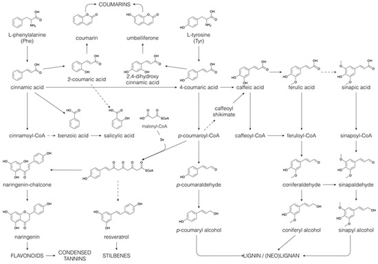 Biosynthesis of coumarins, benzenoids, flavonoids, stilbenoids, lignins and (neo)lignans via the phenylpropanoid pathway. Dashed arrows indicate multiple conversions.