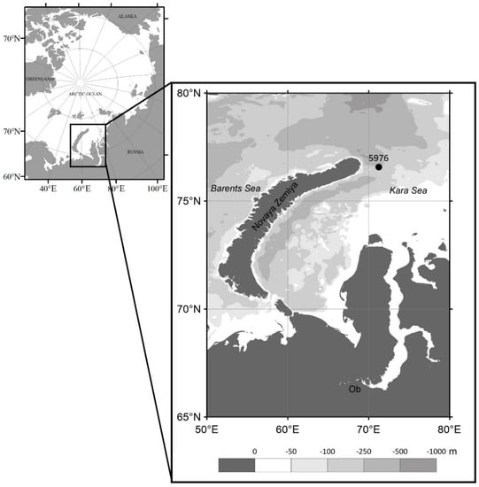 Bathymetric map of the Kara Sea with the location of the moored sediment trap at station 5976.