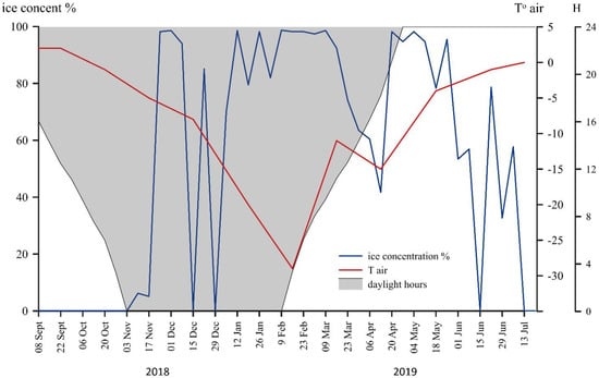 During the year, the air temperature varied from 2 °C in September 2018 to −29 °C in February 2019 (Figure 2). The air temperature was below zero for eight months out of the 10 months that were monitored. The sediment trap was deployed under ice-free conditions, which were maintained until mid-December 2018 (Figure 2). The sea ice covering the area from November 2018 to early June 2019, began to melt in the middle of June and dropped to 0% in mid-July. During November, December, and January, the sun stayed below the horizon for at least 24 h (the polar night). Accordingly, a polar day occurred in May and June (Figure 2).