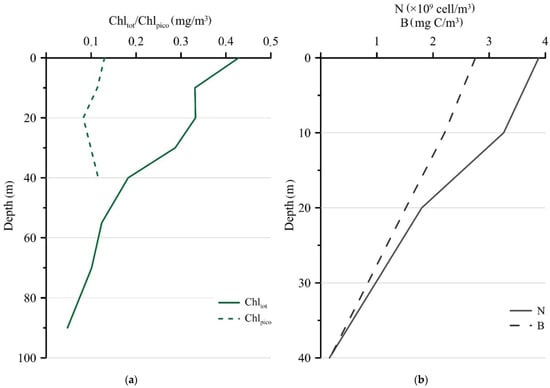 Vertical distribution of Chltot and Chlpico (mg/m3) (a), photosynthetic picoeukaryotes abundance (N, ×109 cells/m3) and biomass (B, mg C/m3) (b) at station 5976 during the setting of sediment trap in September 2018.