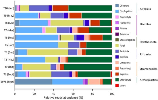 Three phyla predominated in terms of richness in all the studied trap samples: Dinoflagellata, Fungi, and Chlorophyta. They represented an average of 66% of the total richness and accounted for 72% of the total reads. Dinoflagellata, Fungi, and Chlorophyta collectively accounted for significant contributions in autumn (samples T1, T2, and T3) comprising an average of 14%, 21%, and 43% of the total protist reads, respectively. In addition to the dominant phyla, nearly 19% of the sequences affiliated with the Radiolaria order Chaunacanthida were identified in September (T1). In winter (T4, T5, and T6), Fungi dominated only in December (T4), and their relative contribution reached 42%. In January and February, Dinoflagellata was the most important group, accounting for more than 40% of the total reads. Chlorophyta accounted for an average of 21% of the total sequence reads in these samples. In samples T7, T8 and T9, the average contribution of Dinoflagellata reads reached 27%. Chlorophyta and Fungi accounted for an average of 22% and 19% of the total sequence reads, respectively. In the June sample (T10), 45% of the total reads were affiliated with Chlorophyta. Moreover, 20% of all sequences were affiliated with Radiolaria.