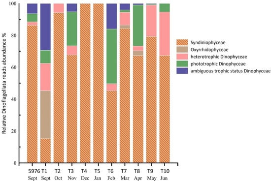 Dinoflagellata were represented by three classes: Syndiniophyceae, Oxyrrhidophyceae, and Dinophyceae. Syndiniophyceae were dominant in almost in all samples, with an average contribution of 73% to the total Dinoflagellata reads. In samples T4 (December) and T5 (January), Syndiniophyceae were the only identified group. All Syndiniophyceae ASVs were assigned to the class level. The contribution of Dinophyceae averaged 23%, and varied from 6% in T2 (October) to 55% in T1 and T6 (September and February). Oxyrrhidophyceae were found only in three samples, T1 (September), T7 (March), and T8 (April), and were represented by two ASVs of the genus Oxyrrhis sp. All Syndiniophyceae and Oxyrrhidophyceae are heterotrophs, while Dinophyceae also includes mixotrophic and phototrophic algae. Fourteen Dinophyceae ASVs were identified to the genus level or a higher taxonomic level and were related to phylotypes with “ambiguous trophic status” (Figure 5).