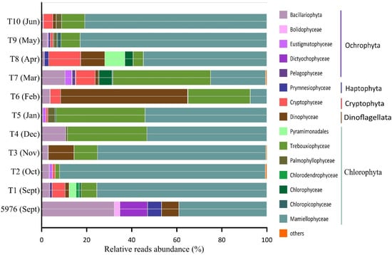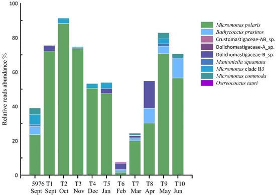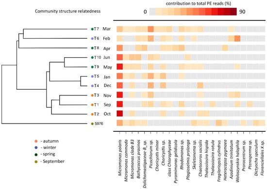 The Bray–Curtis dissimilarity result from the PE sequences clustered the samples into four groups (Figure 8). The samples collected in September, October, and November (T1–T3) were grouped together at 60% similarity. The samples collected in December and January (T4 and T5) were clustered together with the May and June samples (T9 and T10) as sister clusters (62% similarity), indicating the minor composition differences in these two groups of samples. The February, March and April samples (T6, T7 and T8) formed the last cluster with 40% similarity. Water sample 5976 was grouped separately as a single branch. SIMPER analysis showed that the dissimilarity between the clusters was determined by the different contributions of total Micromonas sequences and other algae groups. Therefore, the T1–T3 cluster was characterized by a high contribution of the genus Micromonas to the total number of PE reads (70%), and clusters T4–T5 and T9–T10 was characterized by a high contribution of two Trebouxiophyceae algae, Picochlorum sp. (21%) and Choricystis sp. (13%), and a contribution of Micromonas lower than in the cluster T1–T3 (51%). The similarity of the cluster of the T6–T8 samples was due to Rhodomonas sp. (16%) and the moderate Micromonas (17%) contribution. Water sample 5976 was characterized by a high contribution from diatoms, particularly Fragilariopsis cylindrus (20%).