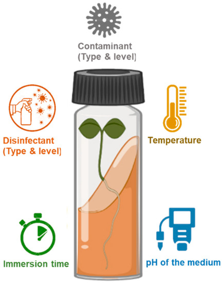 As with most aspects of a tissue culture system, in vitro disinfection is a complex and non-linear process that is affected by numerous factors such as disinfectant and contaminant types and levels, media pH, immersion time, temperature, and their interactions (Figure 1) [7].