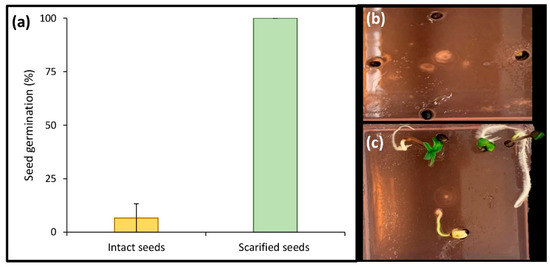 Effect of scarification on in vitro seed germination of cannabis after one week; (a) intact seeds vs. scarified seeds, (b) intact seeds, and (c) scarified seeds.