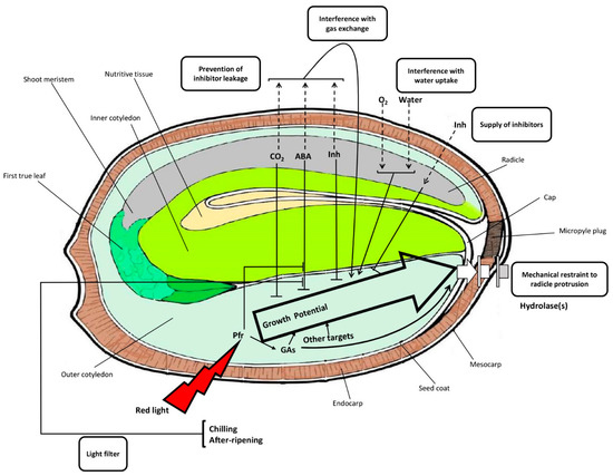 A schematic representation of potential interactions between the embryo and envelopes regulating cannabis seed germination and dormancy. GA: gibberellic acid; Pfr: far-red light photoreceptor phytochrome; ABA: abscisic acid; Inh: inhibitor.
