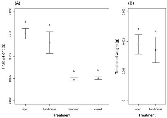 Results of the pollination experiment conducted on Argyreia siamensis in the western population (Ratchaburi, Thailand) showing (A) fruit weight and (B) total seed weight for each experimental treatment (open, hand cross-pollinated, hand self-pollinated, and closed) (mean ± SE). The hand self-pollinated and closed treatments never produced seeds, so these treatments are absent from the graph on the right. Within each graph, treatments with different letters are significantly different (p < 0.05).
