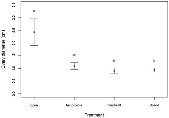 In the western population, fruit and seed sets were found only in the open (natural) and hand cross-pollinated treatments. LMM results revealed that treatment significantly influenced fruit weight (, p < 0.001; Figure 1A). Tukey’s post hoc further revealed that the open and hand cross-pollinated treatments produced significantly heavier fruits than the closed and hand self-pollinated treatments (p < 0.001; Figure 1A). As the close and hand self-pollinated treatments did not produce seeds, only open and hand cross-pollinated treatments could be compared for seed weight, and there was no significant difference between the two treatments (, p = 0.58; Figure 1B). When examining ovary diameter in the eastern population, LMM results revealed significant differences between treatments overall (, p = 0.01), but the post hoc test revealed only marginally significant differences between the open and hand self-pollinated treatments and the open and closed treatments (p < 0.1; Figure 2).