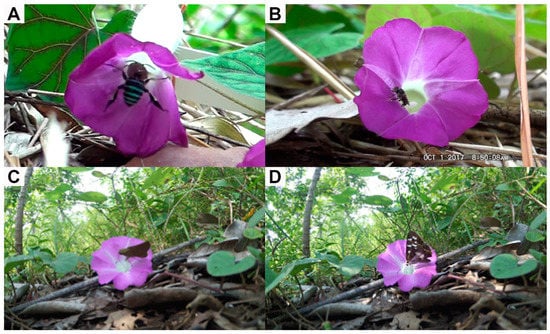 Common pollinators of Argyreia siamensis: (A) Amegilla sp., (B) Meliponini sp., (C) Pelopidas sp., and (D) Udaspes folus.