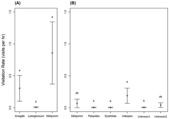 In the western population, the only observed animal visitors were blue-banded bees (Amegilla sp.; Figure 3A), sweat bees (Lasioglossum sp.), and stingless bees (tribe Meliponini; Figure 3B). Based on their behavior, all three taxa were potential pollinators. Meliponini primarily visited between 06.00 and 08.00 h, and then visits declined. They typically landed on the stigmas or stamens while foraging for pollen, and sometimes crawled inside the flower for nectar. Amegilla bees mostly visited between 07.00 and 14.00 h. Amegilla bees are substantially larger than Meliponini bees (Figure 3), and when they crawled into the corolla tube to forage on nectar, their thorax visibly contacted the stigmas and stamens, and pollen was visible along the dorsal thorax. We also observed a Lasioglossum sweat bee visit once, and it traveled along the stigmas and anthers in the process of searching for nectar. The visitation rates of these three taxa were significantly different ( p < 0.001; Figure 4A). Lasioglossum sweat bees visited flowers significantly less often than Amegilla blue-banded bees (p = 0.016), and Meliponini stingless bees (p = 0.004), but the visitation rates of Amegilla and Meliponini bees were not significantly different (p = 0.755) (Figure 4A).