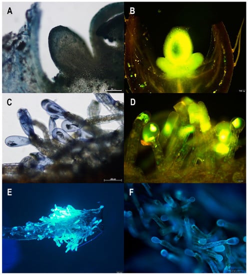 We detected terpenes and flavonoids in both the floral nectary (Figure 5A,B) and the staminal trichomes (Figure 5C,D). Our investigation of autofluorescence under ultraviolet wavelengths revealed that the floral nectary did not fluoresce, but the staminal trichomes did, especially at the head of the trichomes (Figure 5E,F).