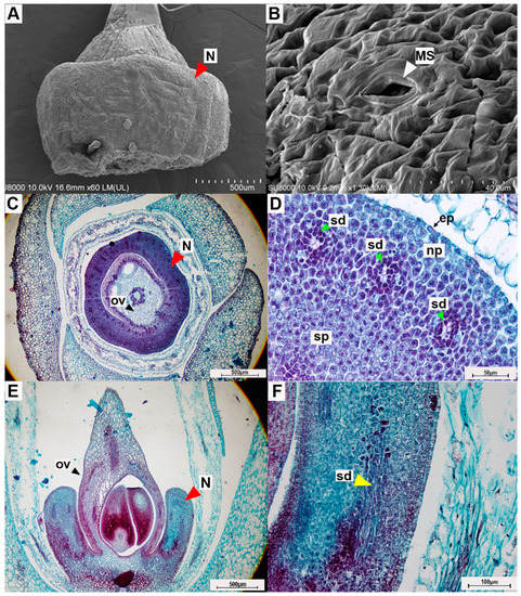 Photographs from micromorphological investigation of the floral nectary of Argyreia siamensis: (A) the entire floral nectary (which surrounds the ovary) and (B) surface of the floral nectary viewed under a scanning electron microscope; (C) transverse section of a mature flower showing the nectary and (D) transverse section showing close-up details of the nectary tissue; (E) longitudinal section of the flower and (F) longitudinal section of the floral nectary showing a close-up view of the secretory duct. In photos C-F, sections were stained with safranin-O and fast green. Abbreviations: N = nectary, MS = modified-stomata, ep = epidermis, ov = ovary, np = nectariferous parenchyma, sp = subnectariferous parenchyma, sd = secretory duct. Scale bars: (A) 500 µm; (B) 40 µm; (C) 500 µm; (D) 50 µm; (E) 500 µm; (F) 100 µm.
