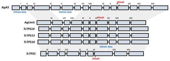 To further investigate the genome structure of the identified TPSs, we attempted to amplify their genome sequences, and successfully obtained the sequences of TcTPS14, TcTPS15, and TcTPS16. Compared with the ancestral form of terpene synthase (Figure 1, Abies grandis abietadiene synthase [26]), the TcTPS14-16 has fewer members of exons due to possible intron loss events, but the structures share the same composition as Abies grandis monoterpene synthase (limonene synthase) [27]. The previously published intron XII loss was not observed in this study [19], thus it is likely an independent evolutionary event that occurred after the differentiation of sesquiterpene and monoterpene synthases.