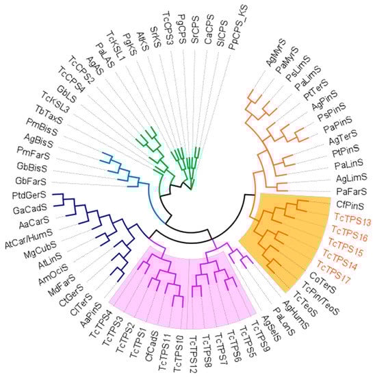 Transcript annotation against the NCBI database showed that TcTPS13, TcTPS15, and TcTPS16 have similar sequences to the α-pinene synthase from Chamaecyparis formosensis. TcTPS14 shares its highest similarity with the terpinolene synthase from Chamaecyparis obtusa, and TcTPS17 has the best result against the previously identified monoterpene synthase from T. cryptomerioides. According to these results, the monoterpene syntheses sequences from Cupressaceae are closely related, and they might form a phylogenetic cluster, which was also observed in sesquiterpene and diterpene synthases.