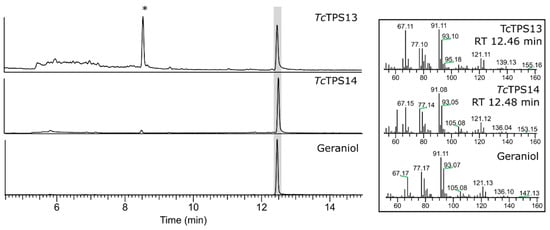 GC-MS analysis of the enzymatic products of TcTPS13 and TcTPS14 and comparison with the geraniol standard.