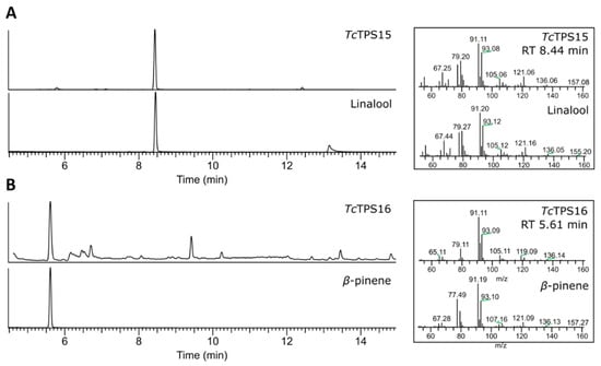 GC-MS analysis of the enzymatic products of TcTPS15 and 16. (A) The metabolic profile of the TcTPS15 product and linalool standard; (B) the metabolic profile of TcTPS16 and β-pinene standard.