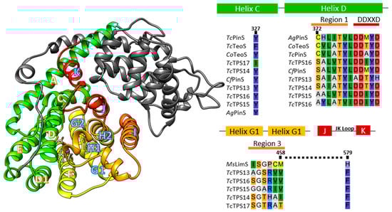 The protein structure of TcTPS13 (model template ID: 2onh.1. A) and catalytic residue alignment. Helixes A to K and their related locations are illustrated in the left panel. The full alignment is illustrated in Figure S1.