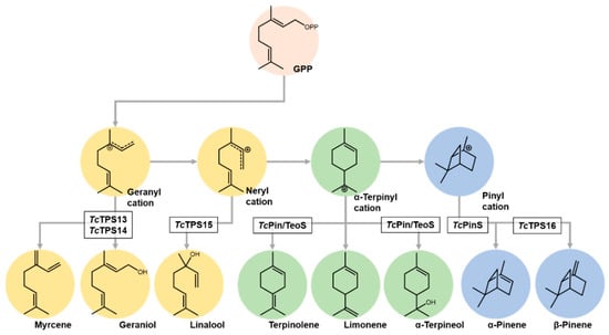 The following are available online at https://www.mdpi.com/article/10.3390/plants10112404/s1, Figure S1: The full alignment of TcTPS13~16 and selected monoterpene synthases, Table S1: Primers used in this study, Table S2: The protein sequences of terpene synthases used in phylogenetic analysis.