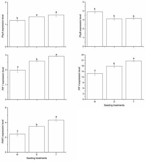 Effects of seeding pattern on the expression of Phy A, Phy B, PIF 1, PIF 4 and PAR 1 genes at the flowering and pegging stage in 2018. Mean values marked followed by different letters differ significantly at p < 0.05. M, monoseeding, D, double seeding, T, triple seeding.