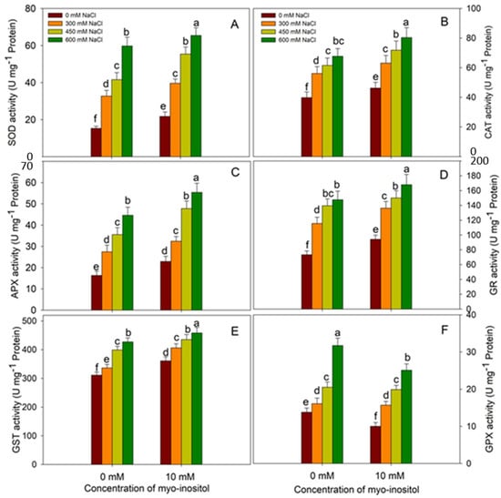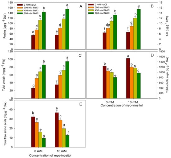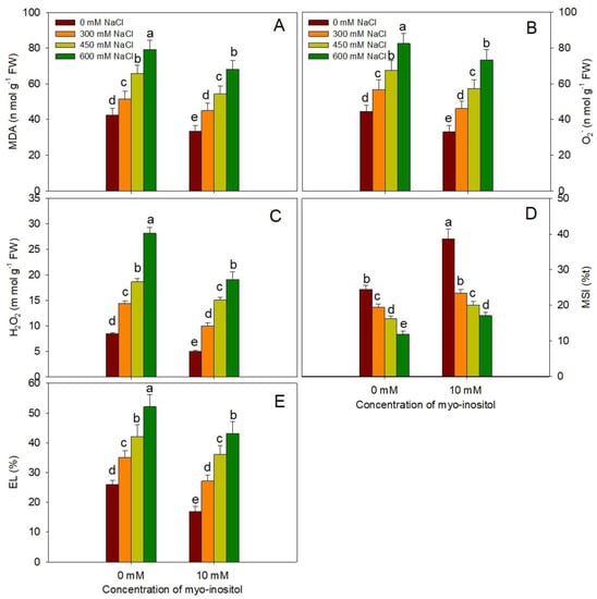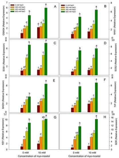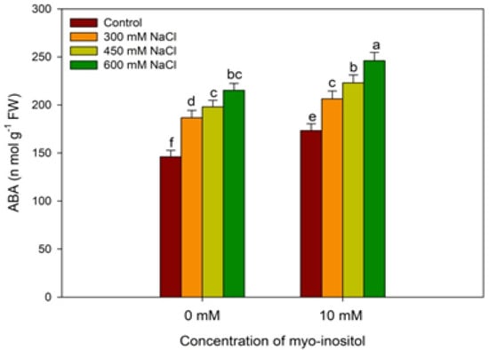 Al-Mushhin, A.A.M.; Qari, S.H.; Fakhr, M.A.; Alnusairi, G.S.H.; Alnusaire, T.S.; ALrashidi, A.A.; Latef, A.A.H.A.; Ali, O.M.; Khan, A.A.; Soliman, M.H. Exogenous Myo-Inositol Alleviates Salt Stress by Enhancing Antioxidants and Membrane Stability via the Upregulation of Stress Responsive Genes in Chenopodium quinoa L. Plants 2021, 10, 2416. https://doi.org/10.3390/plants10112416