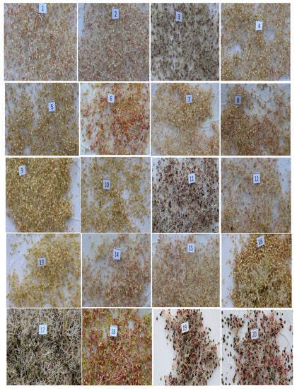 Sprouts were obtained in a time of 72 h, and measured between 1.7 and 2.3 cm in length for all varieties. However, the red variety achieved the greatest length among all varieties (2.1–2.3 cm). The other varieties had lengths as follows: White Junín Ayacucho, 1.7–1.9 cm; T-256, 1.8–1.9 cm; Pasankalla, 1.7–1.8 cm; Suano Puno, 1.7–1.9 cm; T-38, 1.8–2.0 cm; Yellow Sacaca, 1.9–2.0 cm; T-45, 1.7–1.9 cm; Santa Ana, 1.7–1.8 cm; T-61 Pomata, 1.8–1.9 cm; CQA-048, 1.8–2.0 cm; Black Collana, 1.7–1.9 cm; T-72 Huancayo, 1.8–1.9 cm; CQA-043, 1.8–1.9 cm; Salcedo, 1.8–2.0 cm; Ayacucho Compuesto, 1.7–1.9 cm; White Choclito, 1.7–1.9 cm; Yellow Maranganí, 1.9–2.1 cm; Black Coito, 1.7–1.9 cm; and Black, 1.8–2.0 cm. Figure 1 shows the 20 varieties of quinoa germinated under standard laboratory conditions of temperature, humidity, and time.