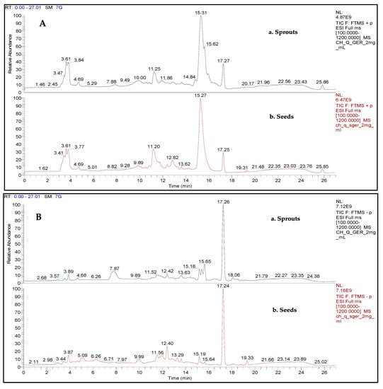 Phytochemical analysis was carried out by LC-ESI-MS/MS for the Pasankalla variety due to its high TPC and TF values and antioxidant capacity, as shown in Table 1, Table 2 and Table 3. Our results indicated that the sprout extract had 90 phytochemical constituents, of which 45 were observed in ESI (−), 33 in ESI (+), and 12 in both modes. In the seed extract, 93 compounds were determined, of which 58 metabolites were observed in ESI (−), 28 in ESI (+), and 7 in both modes, as presented in Table 5. Figure 2 shows the ESI-positive and -negative chromatographic profiles for both sprouts and seeds of the Pasankalla variety.