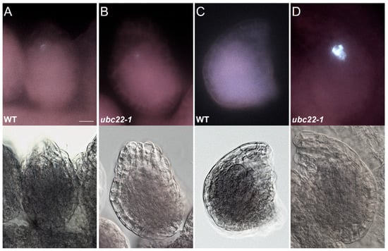 Presence of callose in the late stages of megasporogenesis in WT and ubc22-1 mutant ovules. For each ovule, the callose fluorescent image is shown on the top and the bright-field image is shown on the bottom. WT (A,C) and ubc22-1 mutant (B,D). Scale bar: 10 μm. (A) Weak callose staining at the micropylar end in a WT ovule after meiosis. (B) Weak callose staining at the micropylar end in a ubc22-1 mutant ovule after meiosis. (C) No callose signal in a WT ovule. (D) Strong disorganized callose staining in a ubc22-1 ovule.