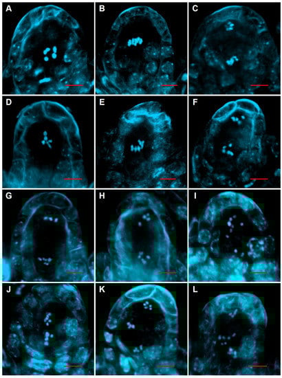 2.2. Analysis of Meiosis in Female and Male Meiocytes Using Chromosome Spreading