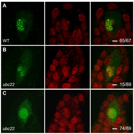The following are available online at https://www.mdpi.com/article/10.3390/plants10112418/s1, Figure S1. Presence of callose in the late stages of megasporogenesis in WT and ubc22-1 mutant ovules. Figure S2. DMC1 immunolocalization in representative WT and ubc22 mutant ovules. Figure S3. ASY1 immunolocalization in WT and ubc22 mutant ovules. Table S1. Meiosis in male meioctyes of WT and ubc22 mutant plants.