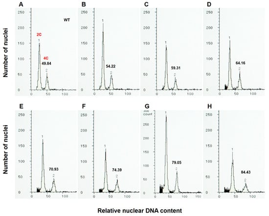 To determine the impact of chromosome abnormalities in the ubc22 mutants on the ploidy level, in addition to whether female or male meiosis is affected, we analyzed the nuclear DNA content in the F1 plants produced from reciprocal crosses between the WT and ubc22-1 mutant. For the flow cytometric analysis, we used young floral bud tissues, since they produced only two major peaks, representing 2C and 4C nuclei (Figure 5A), while the leaf tissues had extra peaks representing 8C and 16C nuclei [48,49]. We adjusted the flow cytometric settings so that the values for the 4C peaks from the WT floral tissues were about 50 (Figure 5A), which allows different plants to be conveniently compared based on the values of the 4C peaks. All the WT plants and F1 plants from the cross with the WT as the maternal parent had a 4C value close to 50 and within the range of 47.5 to 52.5. On the other hand, it was observed that many F1 plants from the cross with the ubc22 mutant as the maternal parent had a nuclear DNA content higher than the diploid (Figure 5B–H), including aneuploids (Figure 5B–E,G,H) and a triploid (Figure 5F).