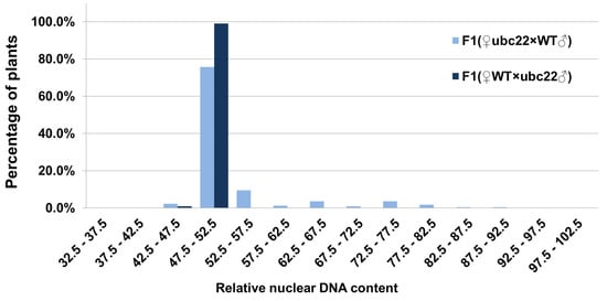 Relative nuclear DNA contents in F1 plants from the reciprocal crosses between the ubc22-1 mutant and WT. F1 plants produced from reciprocal crosses between the ubc22 mutant and WT were grown and their floral buds were used for flow cytometric analysis. Two hundred and twenty-one F1 plants using the ubc22 mutant as the maternal parent and one hundred F1 plants using the WT as the maternal parent were analyzed. In the floral bud tissues, there are two peaks, representing 2C and 4C nuclei (see Figure 5). For comparative analysis among different individuals, the relative value of the 4C peak was used. Parameters of the flow cytometry were set so that the average WT 4C peak value is about 50. The relative 4C values are grouped with increments of 5 s. The 4C peaks of WT samples were around 50 in the group of 47.5–52.5, while the 4C peak values of the plants with a nuclear DNA content of the triploid were in the group of 72.5–77.5.