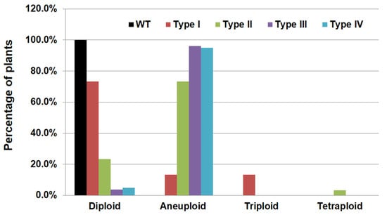 For type I plants, which are similar to the WT, 73.3% were diploids, while there was about 13.3% of both triploid and aneuploid plants (Figure 7). For type II mutant plants, 23.3% were diploids, 73.3% were aneuploids and 3.3% (one out of thirty) was a tetraploid. For type III and IV plants, the vast majority of them (96.2% and 95%, respectively) were aneuploids and only 3.8% and 5% of them were diploids (Figure 7). Those results indicate that type I plants were mostly diploids, that type II plants were unique with a relatively high percentage (13.3%) of triploids and that very high percentages (over 95%) of type III and type IV plants were aneuploids.