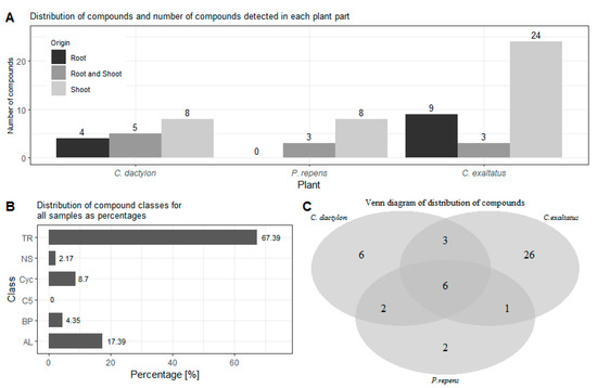 (A)—Shows the distribution of compounds detected in the roots, shoots, and both plant parts for each of the graminoid plants. (B)—Shows the percentage distribution of the classes for the identified compounds for all samples analyzed. (C)—Shows a Venn diagram of the number of unique compounds detected for each of the three plants as well as the number of compounds found in two or all three plant species. TR—Terpenoid, AL—Aliphatics, BP—Benzenoid/Phenylpropanoids, C5—C5-branched compounds, NS—Nitrogen- or sulfur-containing compounds, Cyc—Cyclic miscellaneous compounds.
