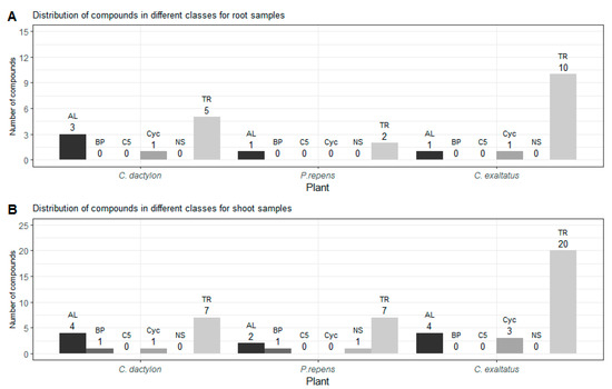 (A)—Shows the distribution of compounds for each class detected in the root samples for the three plants. (B)—Shows the distribution of compounds for each class detected in the shoot samples for the three plants. TR—Terpenoid, AL—Aliphatics, BP—Benzenoid/Phenylpropanoids, C5—C5-branched compounds, NS—Nitrogen- or sulfur-containing compounds, Cyc—Cyclic miscellaneous compounds.