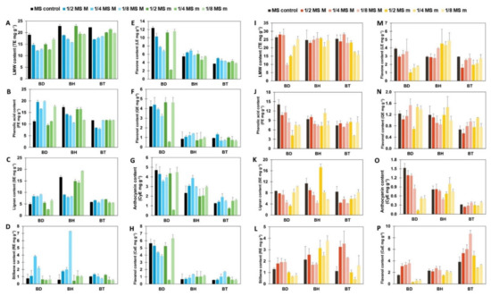 Similar patterns are shown for the biosynthesis of LMW compounds in all three species, whereas a differential behavior was observed for the rest of the phenolic subfamilies (Figure 4). In the case of phenolic acids, they mostly accumulated in aerial parts, but copper played a pivotal role depending on the species, causing a positive effect on BD, whereas it was shown as an inhibitor on BH and BT. Concerning lignans and stilbenes, BH followed a differential pattern with respect to BD and BT, since lignans mainly accumulated in BH, whereas the mineral requirements for stilbene biosynthesis were contrary to those found for BD and BT. Flavonols mainly accumulated in the aerial parts of BD, together with anthocyanins, the latter being also present in the aerial parts of BH, whereas both subfamilies were present in low concentrations in BT. Finally, flavanols showed a characteristic pattern, since they mostly accumulated in the roots of BT, with magnesium playing a positive role, whereas in the case of BD, they accumulated in aerial parts and were inhibited by magnesium.