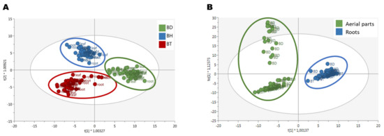 Afterward, a semi-quantification of phenolic compounds was performed, using reference compounds for each subfamily. The results are shown in Figure 1, for both aerial parts (Figure 1A–H) and roots (Figure 1I–P). As it can be seen by the statistical analysis performed by factorial analysis of variance (ANOVA), all the factors tested: genotypes, plant organs, and culture media composition, influenced the accumulation of phenolic compounds, as well as their potential interactions (p < 0.001; Table S2). Due to a large number of factors and data collected, the information provided by such analysis for the identification of simple patterns and/or identification of interactions between variables was limited. Consequently, a multivariate statistical approach was carried out to determine the influence of the genotypes and the organs on the biosynthesis of phenolic compounds. An Orthogonal Projection in Latent Structures—Discriminant Analysis (OPLS-DA) was used, revealing the discriminant compounds between species (BD, BH, and BT) and their organs (aerial parts and roots) (Figure 2). Additionally, the Variable Importance in Projection (VIP) selection method was used to identify the VIP markers implicated in the discrimination between genotypes (Table S3) and plant organs (Table S4).